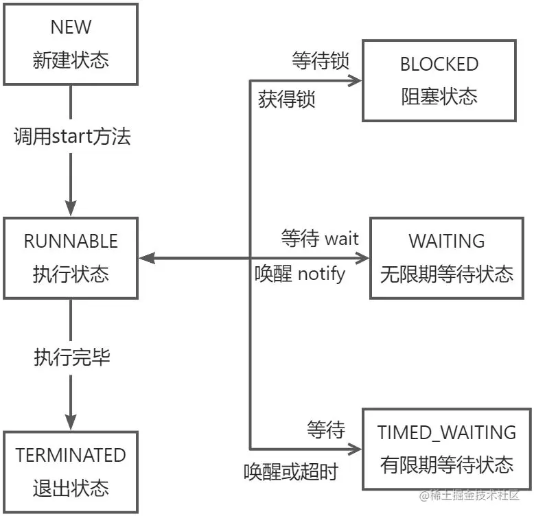 - NEW:新建状态,new Thread()时处于这个状态,此时线程还未开始执行