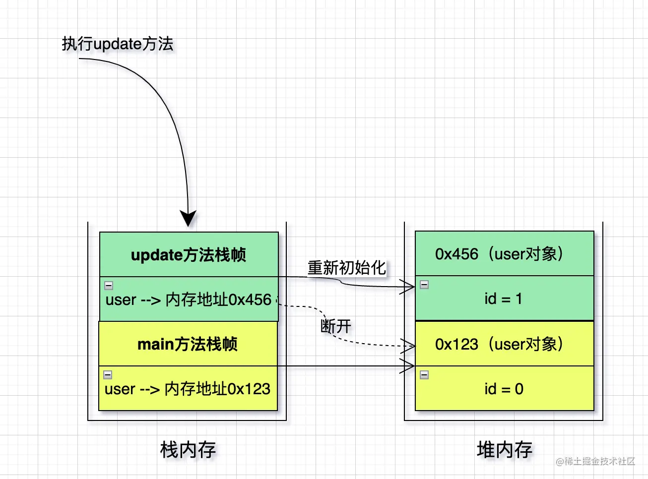 当执行update方法,重新初始化user对象,并重新赋值的时候。会在堆内存中再开辟一块内存,再把栈内存中update栈帧指向新的堆内存地址,并修改新的堆内存中的数据。