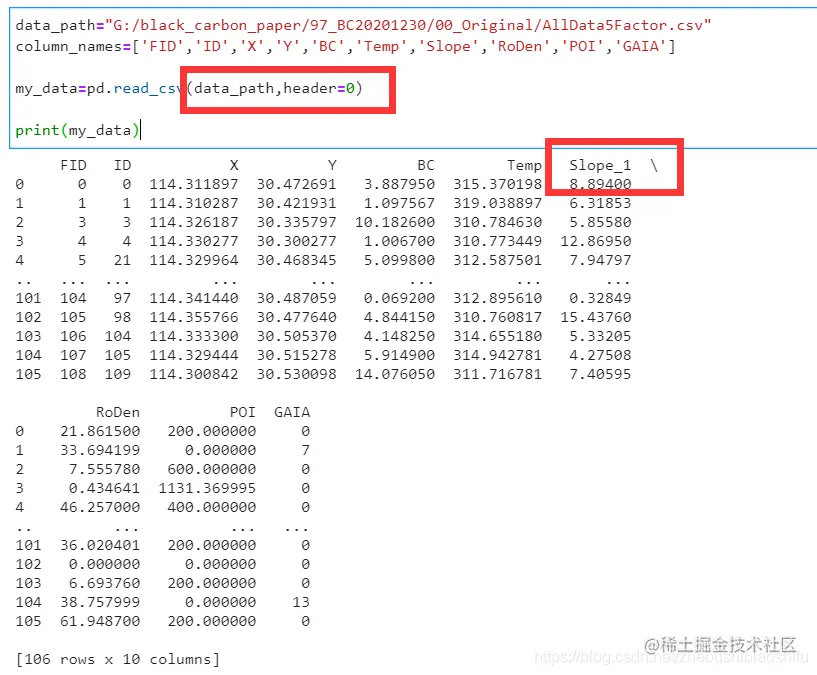 可以看到,导入Python后数据的第7列,原本叫做Slope_1,但是设置我们自己命名的column_names后,其就将原本数据的列标题改为我们自己设定的标题Slope了。如果我们不设置column_names,导入的数据就是这个样子: