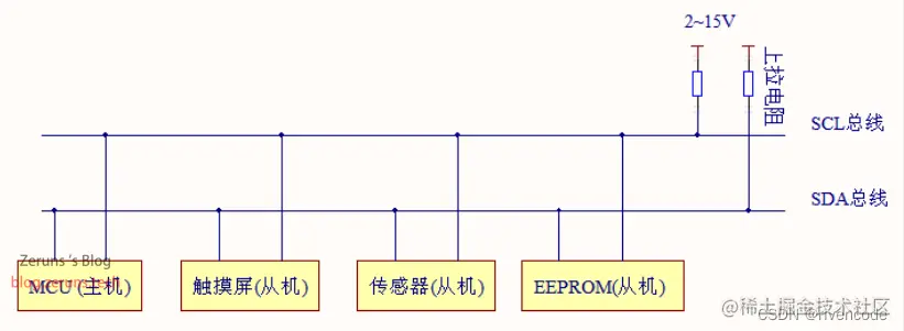 (2) 一个 I2C 总线只使用两条总线线路,一条双向串行数据线SDA(Serial Data Line ),一条串行时钟线SCL(Serial Data Line )。数据线即用来表示数据,时钟线用于数据收发同步