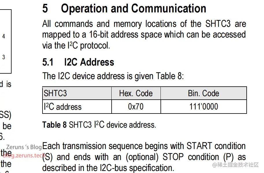 在实际的使用过程中,SHTC3的设备地址需要与读写数据/命令方向位组成一个字节同时发送,字节的最低位为读写数据/命令方向位,高7位是SHTC3的设备地址。