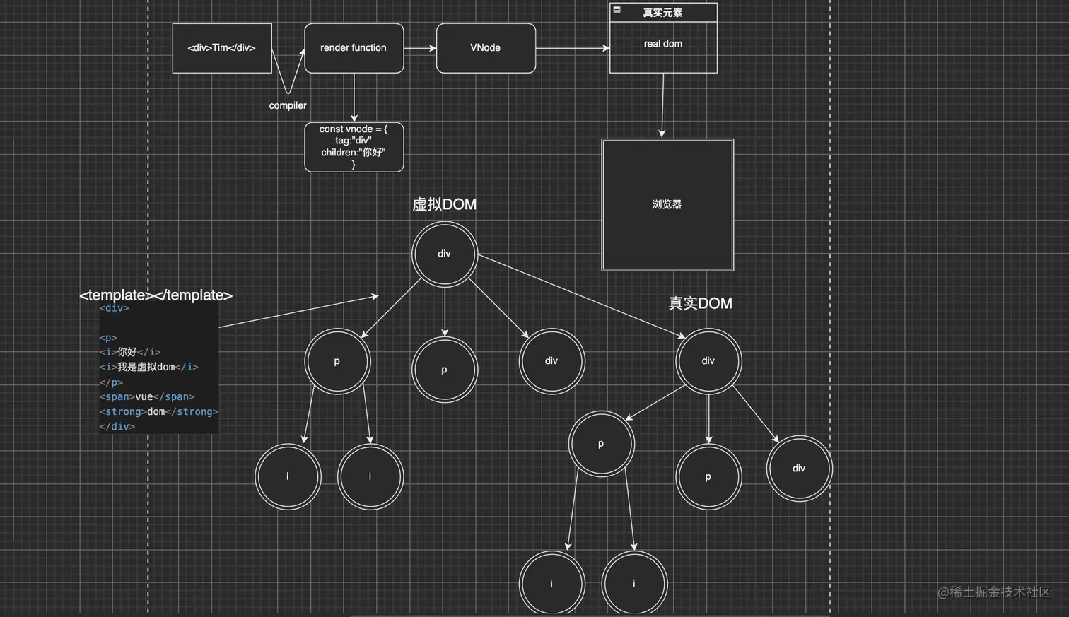 其次就是方便实现跨品台,包括你可以将VNode节点渲染成任意想要的节点