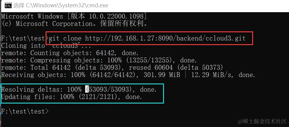 (2)进入文件夹,点击地址栏直接输入cmd,弹出命令框输入git clone 前面复制的http地址。