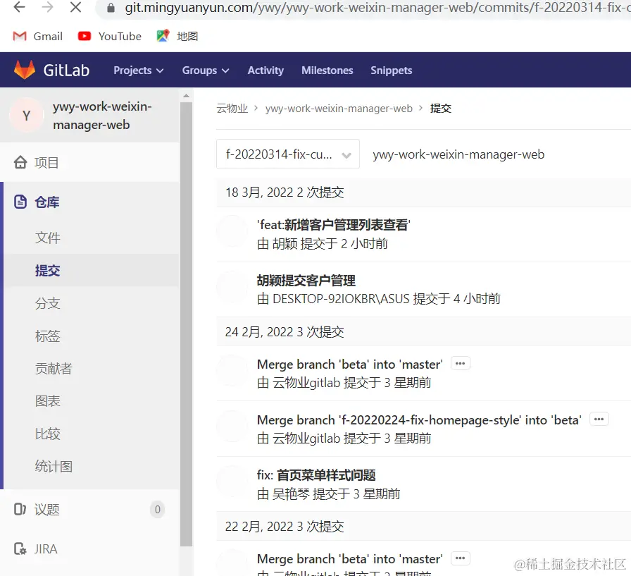 a、git push之后可以通过 仓库->提交 来查看已经提交的内容