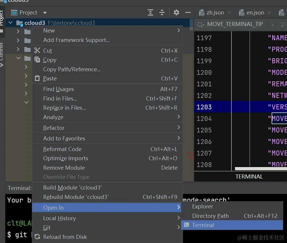 (2)右击文件,选择Terminal,即可打开终端。在终端就可以进行其他git命令操作