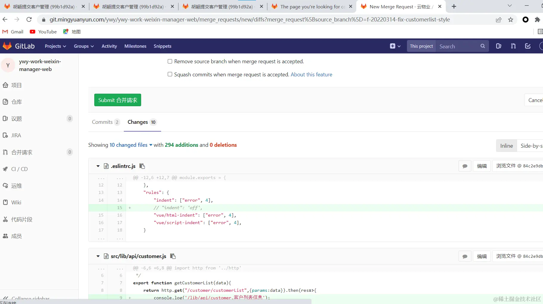 git push后自动生成merge链接,通过链接->Changes来查看你修改的部分,注意不要点击Submit提交(只用来查看)