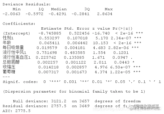 基于AIC的step()函数将模型变量减少到8个:男性、年龄、cigsPerDay,prevalentStroke、prevalentHyp、totChol、sysBP和glucose。值得注意的是,通过step()找到的最佳模型实例具有不显著的变量。