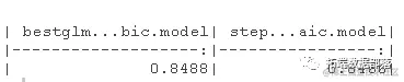 AIC方法和BIC方法都能产生相同的准确性。该选择哪种方法呢?我宁愿选择AIC,因为该模型实例有更多的预测因素,因此更有洞察力。然而,选择BIC模型实例也是合理的,因为它更简明。与model1的准确度相比,我们通过变量选择在准确度上有0.8475-0.842=0.00550.8475-0.842=0.0055的提高。然而,我们失去了关于其他预测因子和因变量关系的信息。