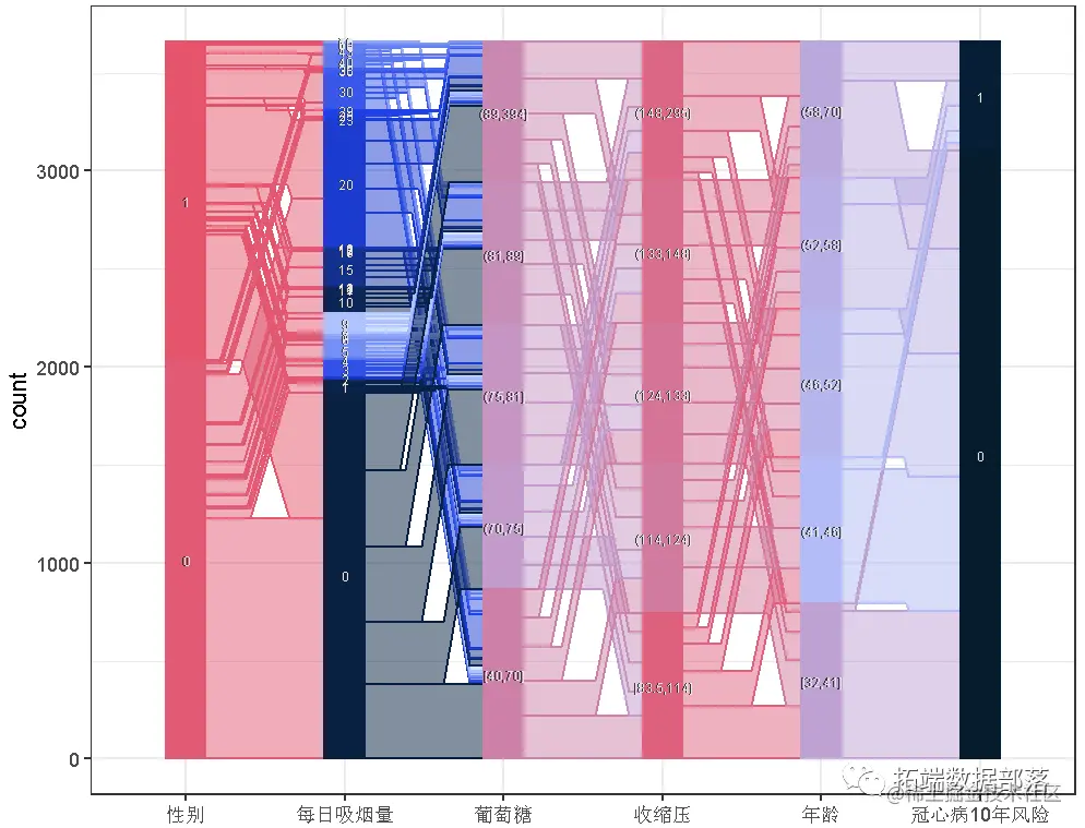 然而,平行坐标仍然显示了一些有趣的点。例如,年龄组与 "十年健康发展 "结果之间的关联很有意思。较低的年龄组在TenYearCHD==TRUE中的参与度很低,这意味着年龄与该疾病有正相关。另一方面,与男性相比,女性(男性==FALSE)在0支烟和[1,20]支烟组的贡献更大。换句话说,男性倾向于抽更多的烟,而且是重度吸烟者。