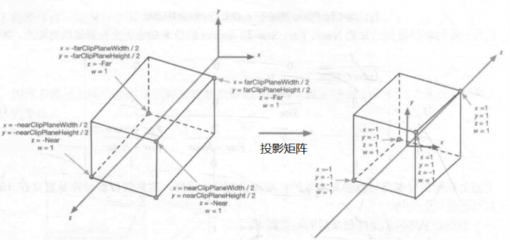 在摄像机使用透视投影的时候,为了呈现出近大远小的透视收缩(perspective foreshortening)效果,需要对顶点进行透视投影变换。使用透视投影矩阵进行变换后,并没有进行裁剪,只是使得w值有了意义,为后面的裁剪做准备。