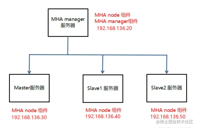- 目前MHA支持一主多从架构,最少三台服务器,即一主两从。
