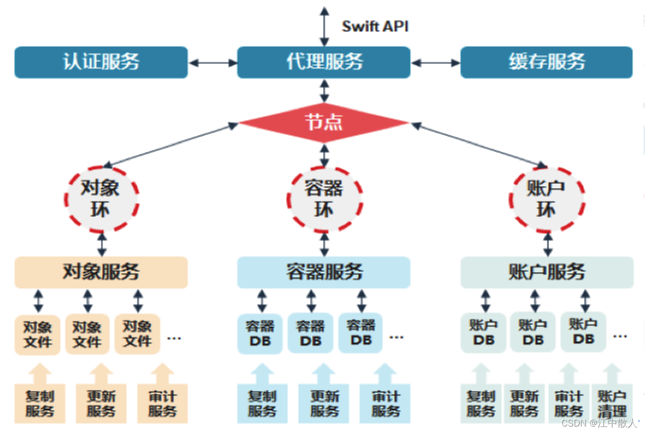 - 账户清理服务(Account Reaper):移除被标记为删除的账户,删除其所包含的所有容器和对象