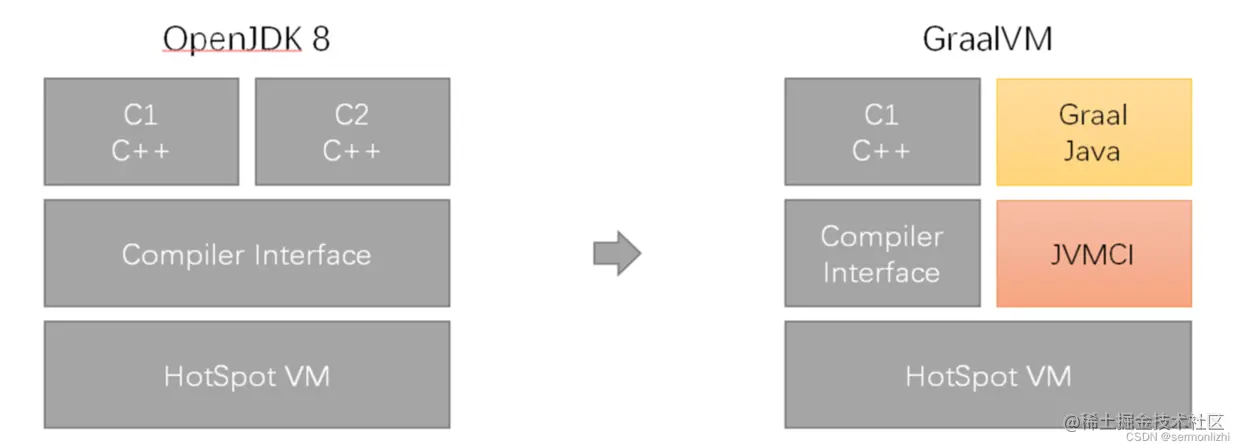 但在Graal之前,以JDK8为例,即时编译器与Java虚拟机时紧耦合的,也就是说对即时编译器的更改需要重新编译整个Java虚拟机,这对于开发相对活跃的Graal来说是难以接收的。
