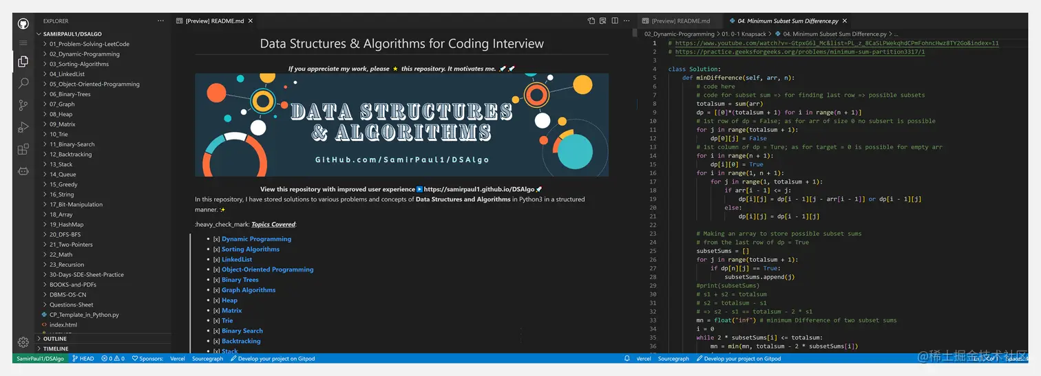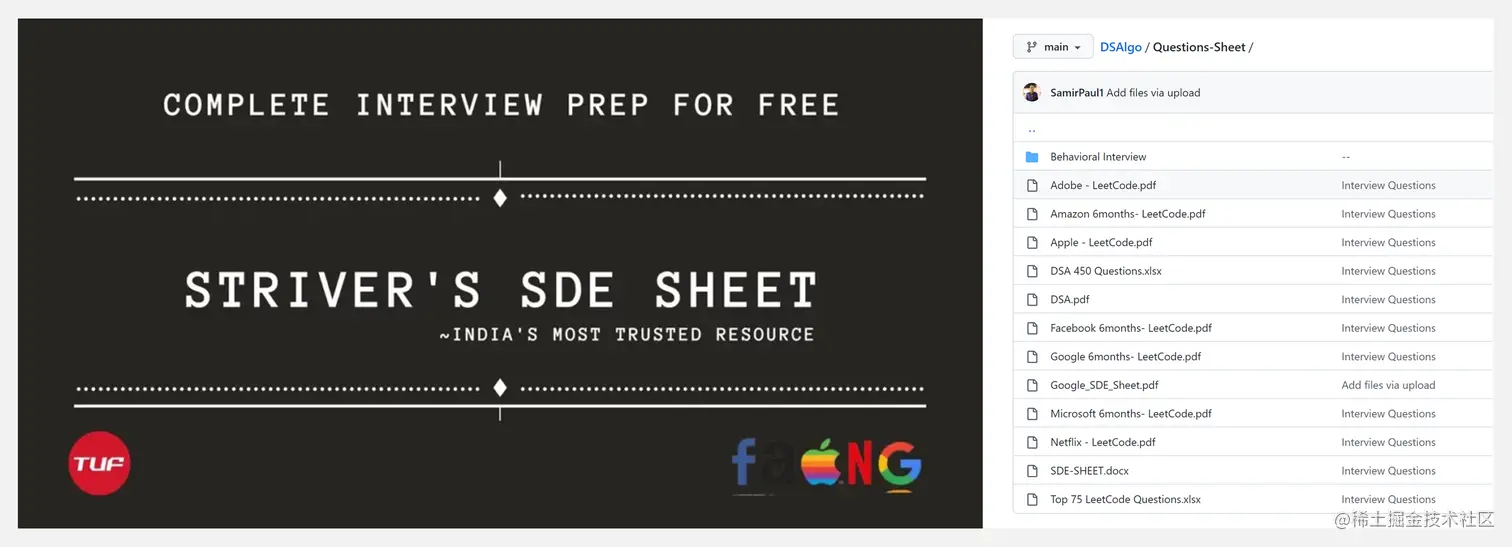 此外,『30-Days-SDE-Sheet-Practice』文件夹包含问题、解决方案及简短注释,对正在准备 Striver SDE 面试的读者会很有帮助。『Questions-Sheet』文件夹列有顶级产品公司提出的问题。『BOOKS-and-PDFs』文件中包含计算机科学基础的重要书籍 PDF。