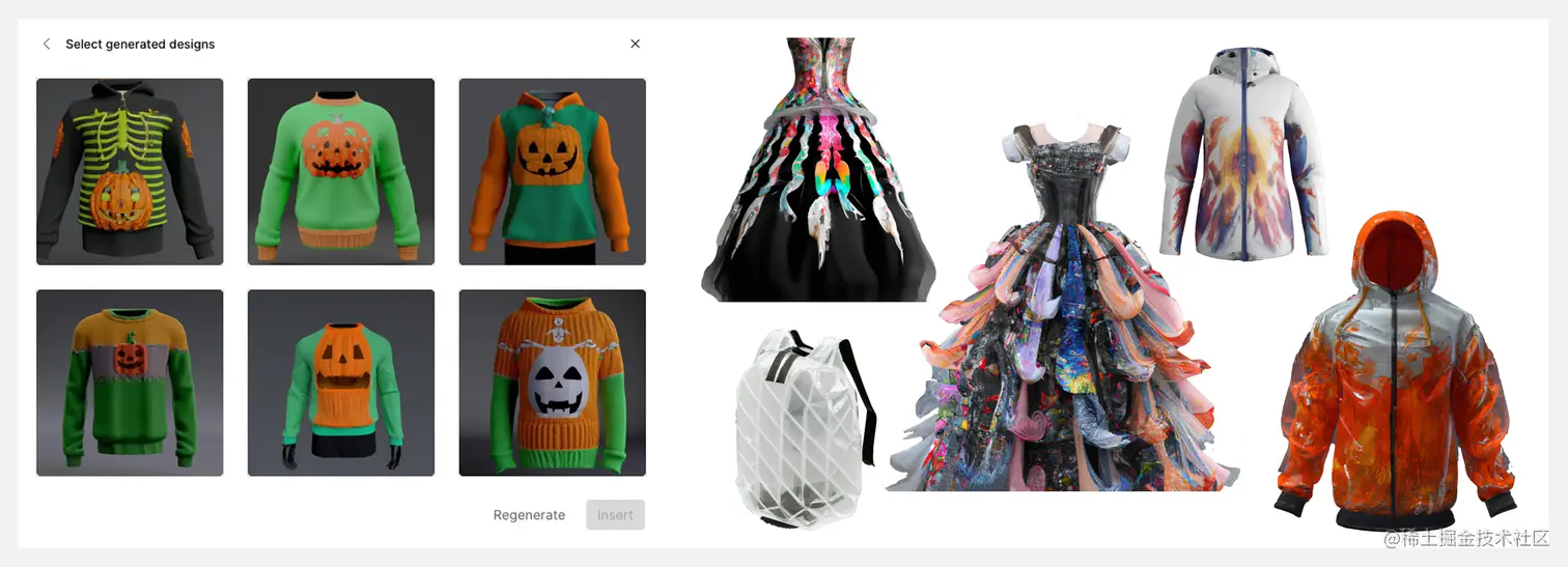 设计人员先从 25 个列表中选择基础款式(例如毛衣、衬衫、手提包等),然后输入提示文本来描述整体的设计创意并选择材质,最后输入提示文本来修改装饰细节(如袖口或拉链等)。下方『万圣节毛衣』的整个设计过程不到一分钟。需要注意的是,CALA 并不是一键式设计工具,CALA 平台的使用过程仍需设计师的技能和经验储备。但它显著降低了新设计师的进入门槛,并为资深设计师提供海量创意提升工作效率。