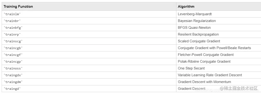 其中,TrainVARI、TrainYield分别是我这里训练数据的自变量(特征)与因变量(标签);trainFcn为神经网络所选用的训练函数方法名称,其名称与对应的方法对照如下表: