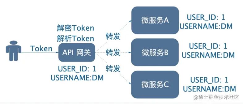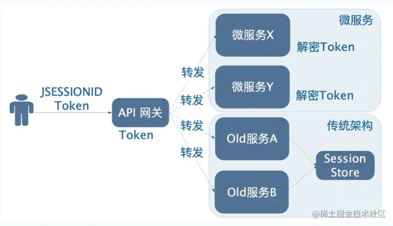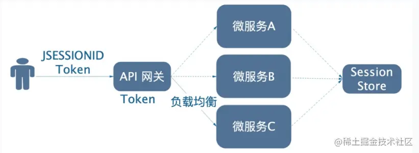 外部依然针对于Token进行传递到API网关服务,之后进行相关的微服务执行处理,并且后端采用的是将统一化的Session Store的存储介质,之后,可以实现即使是无状态化的服务架构,这个目前使用的较多。