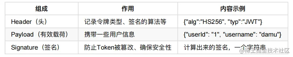 JWT由三部分组成:第⼀部分是Header,第⼆部分是Payload,第三部分是Signature