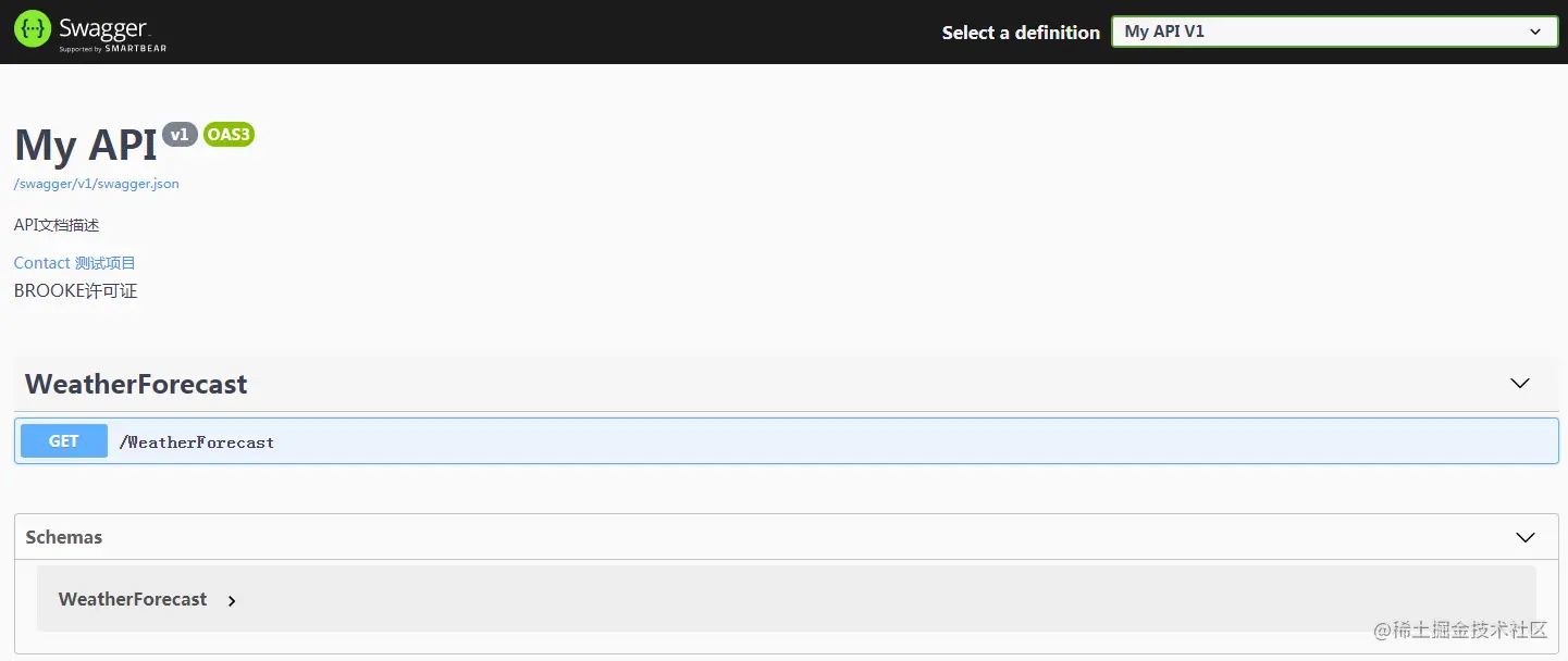 services.AddSwaggerGen(c => { c.SwaggerDoc("v1", new OpenApiInfo { Title = "My API", Version = "v1", Description = "API文档描述", Contact = new OpenApiContact { Email = "5007032@qq.com", Name = "测试项目", //Url = new Uri("http://t.abc.com/") }, License = new OpenApiLicense { Name = "BROOKE许可证", //Url = new Uri("http://t.abc.com/") } }); var xmlFile = $"{Assembly.GetExecutingAssembly().GetName().Name}.xml"; var xmlPath = Path.Combine(AppContext.BaseDirectory, xmlFile); c.IncludeXmlComments(xmlPath); });上述代码通过反射生成与Web API项目相匹配的XML文件名,AppContext.BaseDirectory属性用于构造 XML 文件的路径,关于OpenApiInfo内的配置参数用于文档的一些描述,在此不作过多说明。