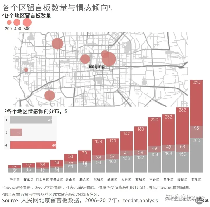 从地区来看,活跃在各大媒体的“朝阳区群众”留言数目也是最多的,其次是海淀区,昌平区。因此,从情感分布来看大部分留言还是在反应存在的问题,而不是一味赞美或者灌水。