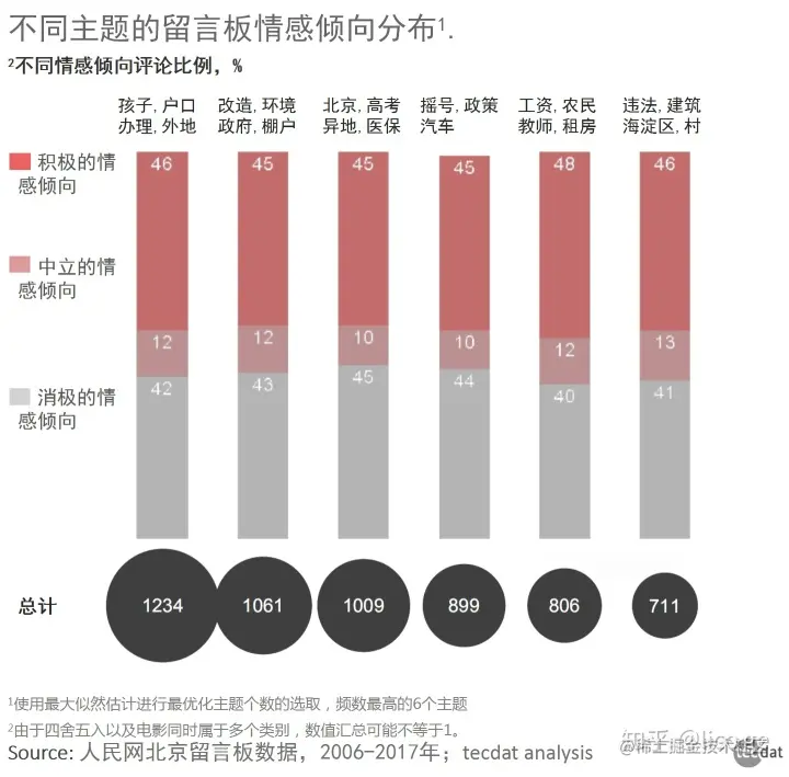 接下来我们分析了不同主题和地区的情感倾向分布。从下图可以看出,主题3高考和医保、主题6 违法建筑、主题13教育拆迁的留言内容中积极情感占较大比例。