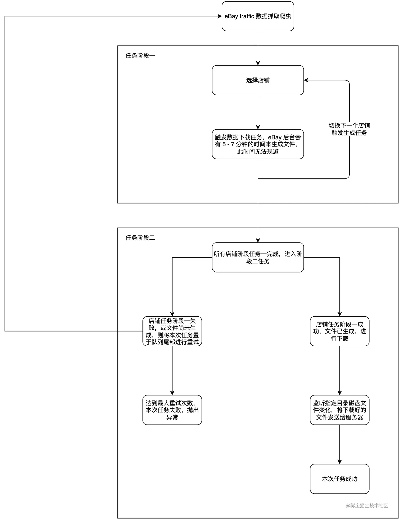 经过调研,单次自动化任务需要花费 7 - 10 分钟时间,主要花销在于等待 ebay 后台生成下载任务需要较长时间,且无法规避。考虑 ebay 店铺较多(133 个),整体执行时间过长,所以准备将单个爬虫任务拆分成两部分,第一部分先触发所有店铺的生成下载任务,第二部分进行文件下载,node 模块需要进行对应的任务调度,保证爬虫任务的执行顺序。