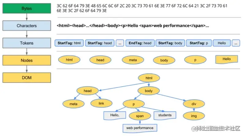Bytes → characters → tokens → nodes → DOM