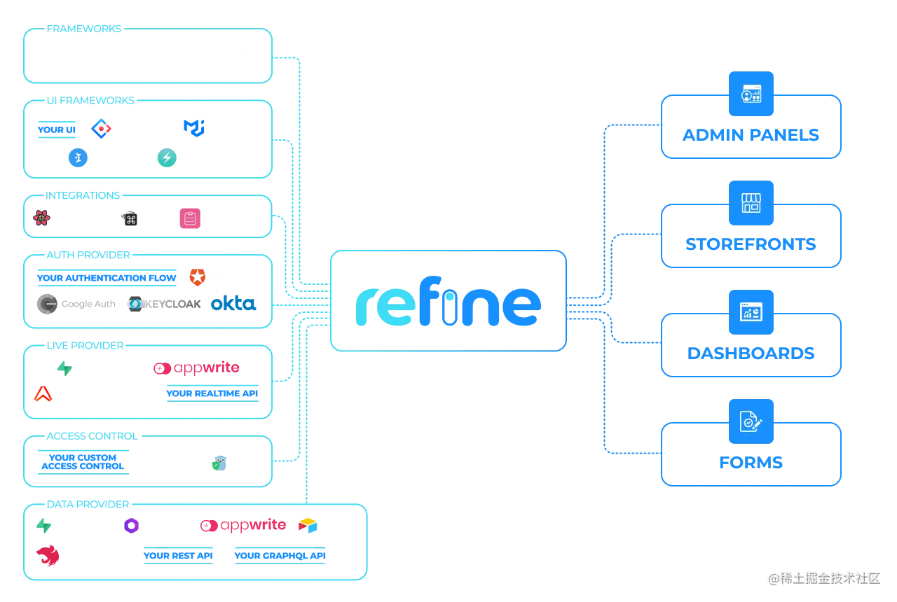 refine 可快速开发基于 React 的 Web 应用,你无需进行 CRUD 的重复工作。此外,refine 还提供身份验证、访问控制、路由、网络管理、i18n 等功能。