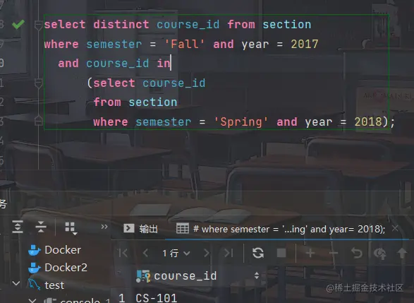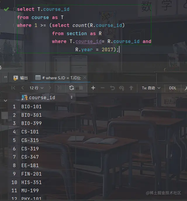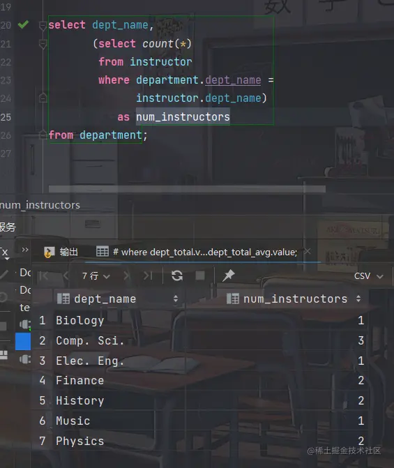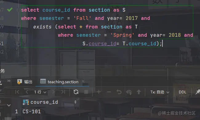 SQL允许子查询出现在返回单个值的表达式能够出现的任何地方,只要该子查询只返回包含单个属性的单个元组。