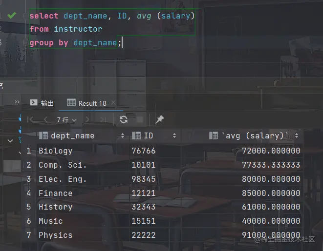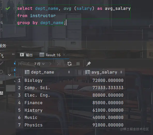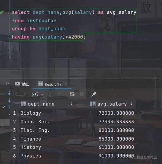 考虑查询 "找出系平均工资超过42000美元的那些系中教师的平均工资"