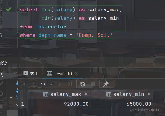 - 找出“Comp. Sci. ”系教师的最高工资和最低工资