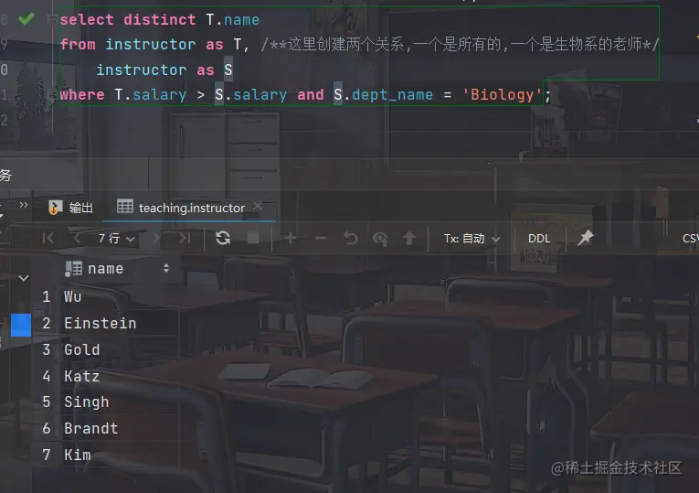 - 将Instructor 关系按照salary降序,salary相同时按照name升序排列