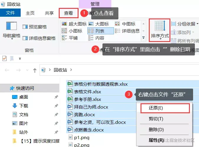 具体操作步骤:打开电脑【回收站】,在页面上方找到【排序方式】,点击里面的【删除日期】,能够快速找到最近删除的文件。在里面找到之前丢失的文件,右键点击文件【还原】。