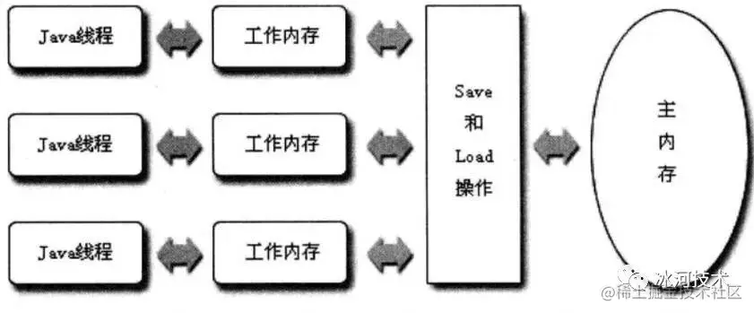 所以的变量都存储在主内存,每条线程还有自己的工作内存,保存了被该线程使用到的变量的主内存副本拷贝。线程对变量的所有操作(读取、赋值)都必须在工作内存中进行,不能直接读写主内存的变量。不同的线程之间也无法直接访问对方工作内存的变量,线程间变量值的传递需要通过主内存。