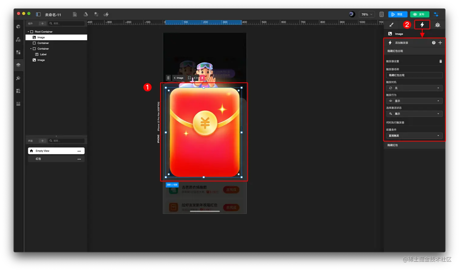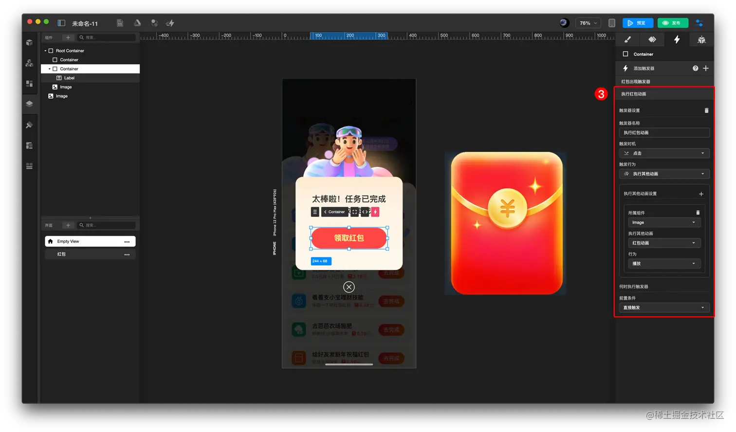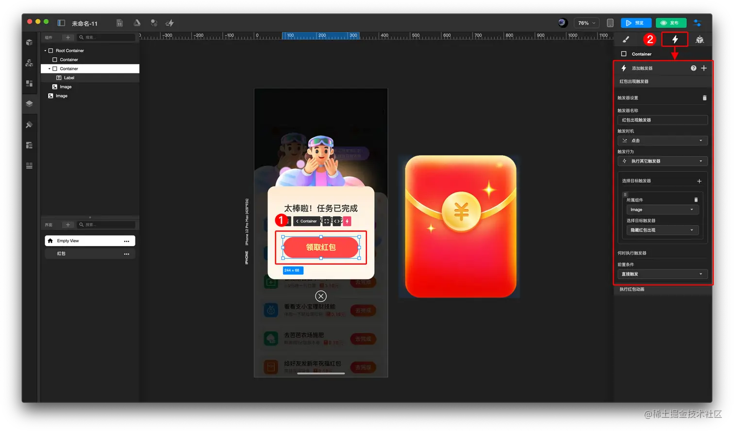 如何制作红包领取效果 TOWIFY 2022-11-07 390 阅读1分钟 效果展示: 前置准备: 已经搭建好的缺少动画效果的红包页面 具体步骤: 配置领取红包按钮 配置红包出现动画效果 步骤分解: 配置领取红包按钮 选中领取红包 按钮 组件 在 触发器 中,添加配置红包出现 触发器 在 触发器 中,添加配置执行红包动画 触发器 配置红包出现动画效果 选中红包 图片 组件 在 触发器 中,添加配置隐藏红包出现 触发器 在 触发器 中,添加配置隐藏红包 触发器 点击上方面板中的 动画,添加 组合动画 并进行配置数据