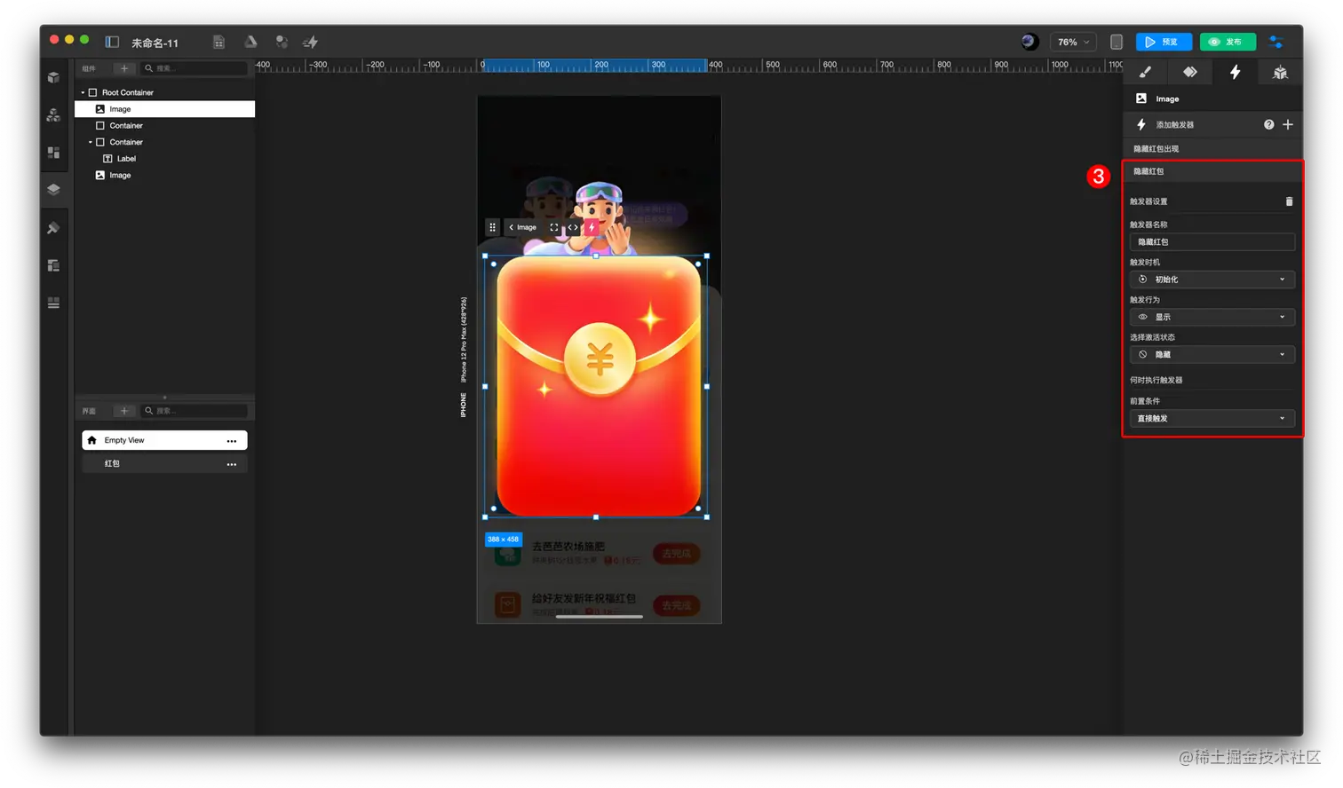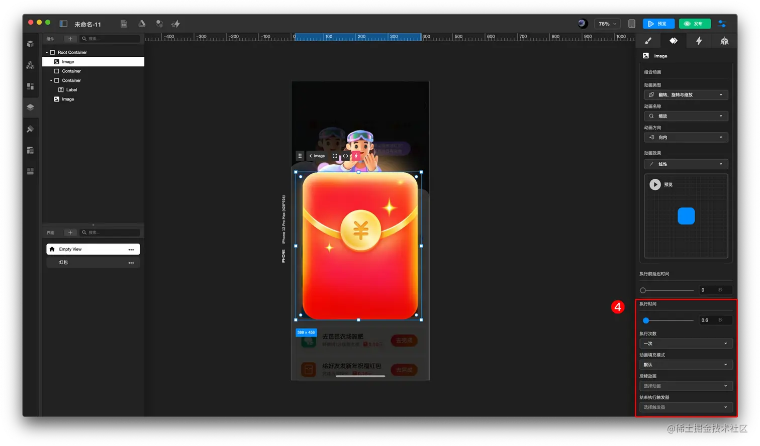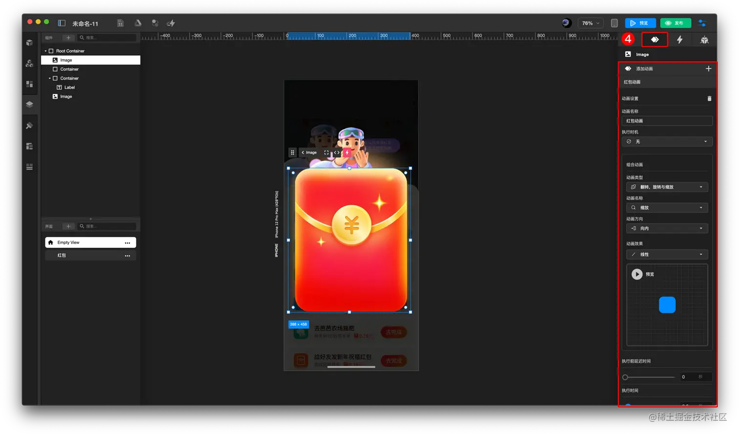 如何制作红包领取效果 TOWIFY 2022-11-07 390 阅读1分钟 效果展示: 前置准备: 已经搭建好的缺少动画效果的红包页面 具体步骤: 配置领取红包按钮 配置红包出现动画效果 步骤分解: 配置领取红包按钮 选中领取红包 按钮 组件 在 触发器 中,添加配置红包出现 触发器 在 触发器 中,添加配置执行红包动画 触发器 配置红包出现动画效果 选中红包 图片 组件 在 触发器 中,添加配置隐藏红包出现 触发器 在 触发器 中,添加配置隐藏红包 触发器 点击上方面板中的 动画,添加 组合动画 并进行配置数据
