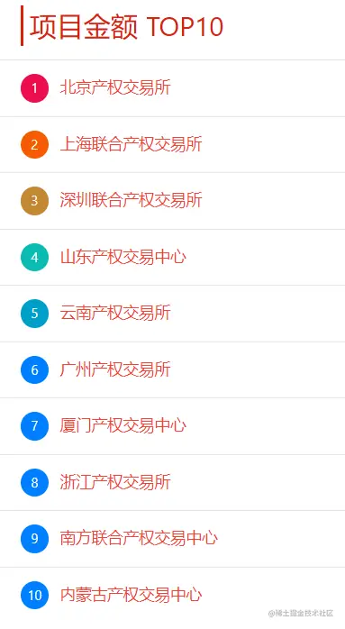 本周交易机构新增披露项目金额排名TOP10有:北京产权交易所、上海联合产权交易所、深圳联合产权交易所、山东产权交易中心、云南产权交易所、广州产权交易所、厦门产权交易中心、浙江产权交易所、南方联合产权交易中心、内蒙古产权交易中心