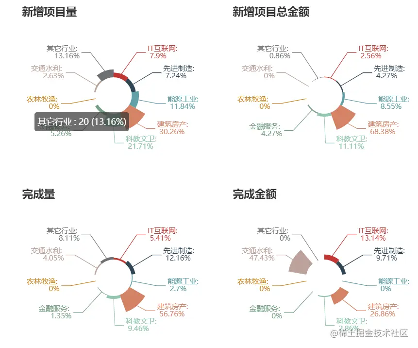 塔米周报按照行业对新增项目量、新增项目总金额、完成项目量、完成项目金额进行了统计并可视化展示。