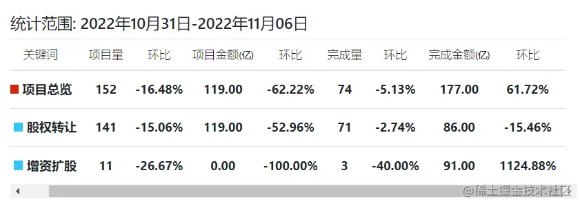 主要对项目总览、股权转让、增资扩股进行汇总,从项目量、项目金额、完成量、完成金额等维度出发,并做了环比计算。详情如下图: