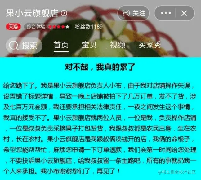2020年 11 月,淘宝店铺果小云,因为不熟悉操作,误将26元4500克的脐橙写成了4500斤,结果被一群职业羊毛党一晚上下了几万个订单,一夜之间损失700万,逼得店主跪下求退单。