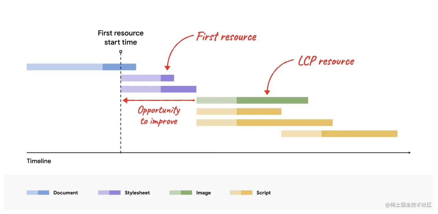 一个好的经验法则是,您的LCP资源应该在该页加载第一个资源的同时开始加载。或者,换句话说,如果LCP资源开始加载比第一个资源晚,那么就有改进的机会。