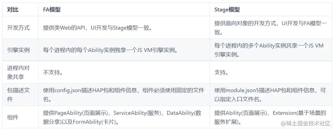 然而从API 9开始,Ability框架引入了Stage模型作为第二种应用框架形态,Stage模型将Ability分为PageAbility和ExtensionAbility两大类,其中ExtensionAbility又被扩展为ServiceExtensionAbility、FormExtensionAbility、DataShareExtensionAbility等一系列ExtensionAbility,以便满足更多的使用场景。新模型接口中有AbilityStage/WindowStage的概念,这个Stage本身有舞台的意思,寓意是给开发者一个新的展现舞台。Stage模型的设计,主要是为了开发者更加方便地开发出分布式环境下的复杂应用。下表给出了两种模型在设计上的差异: