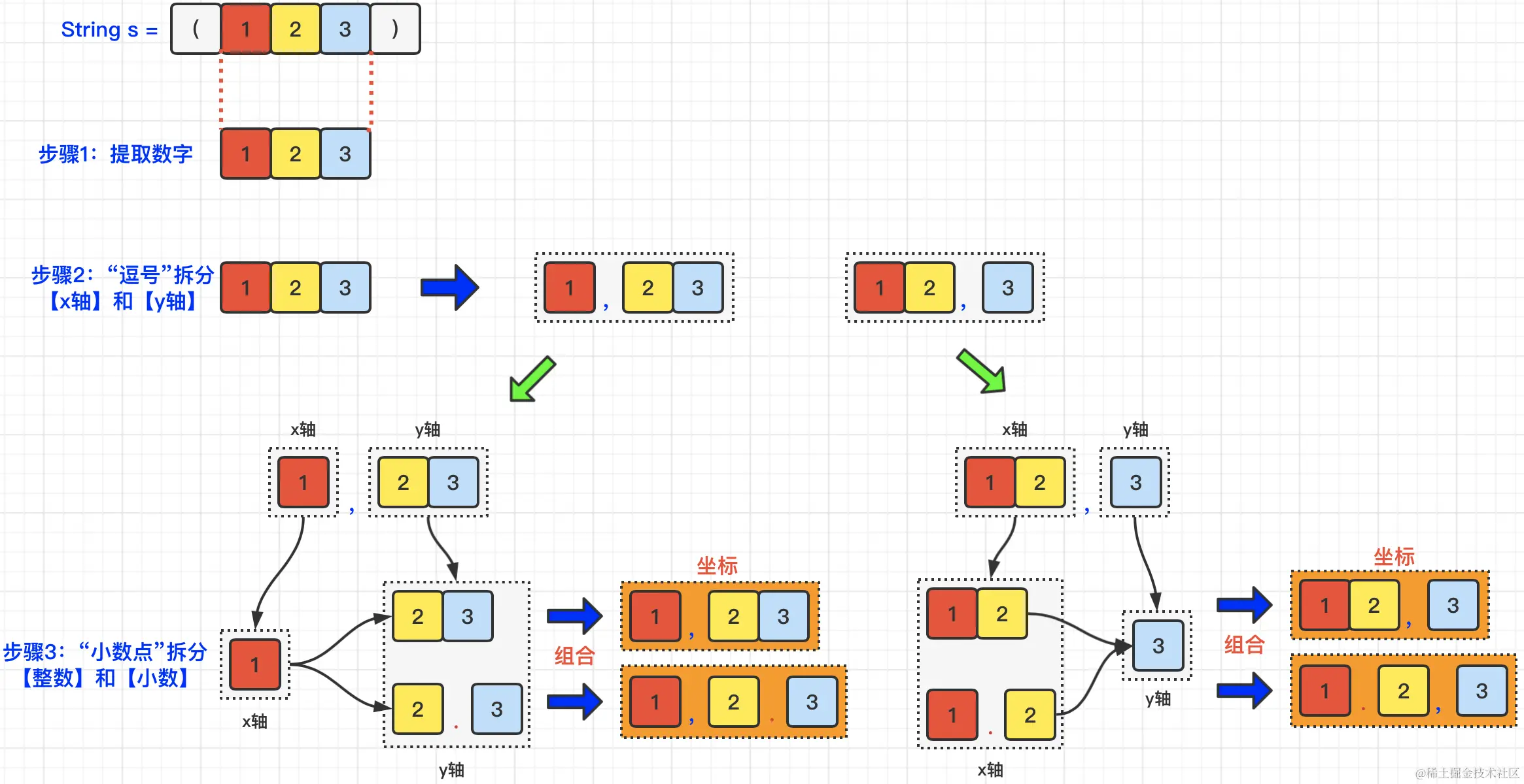 【最后】:分别针对x轴数字和y轴数字,进行“小数点”拆分,然后拼装成最终的坐标。