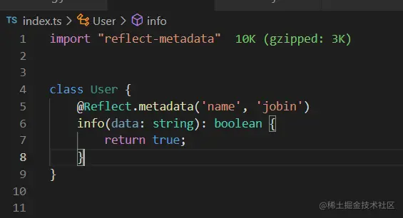 Reflect Metadata是15年的一个提案,如果要用Reflect Metadata就要借助三方包(reflect-metadata)。我们需要去安装一下该npm包:
