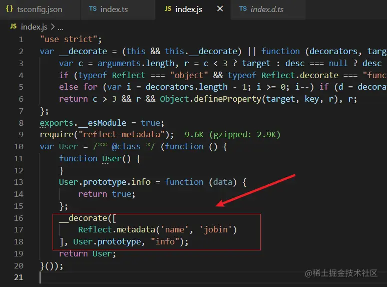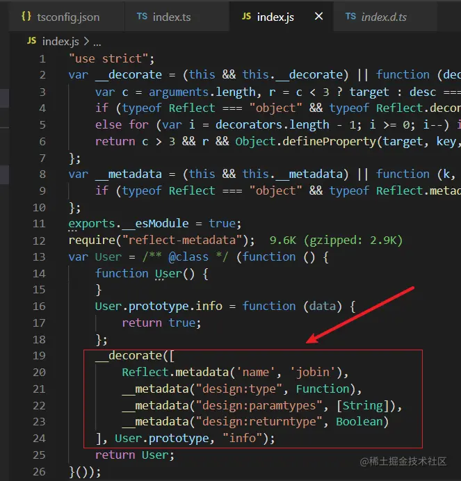 用tsc去编译一下之后可以得到后的index.js,已经有了我们定义的元数据。