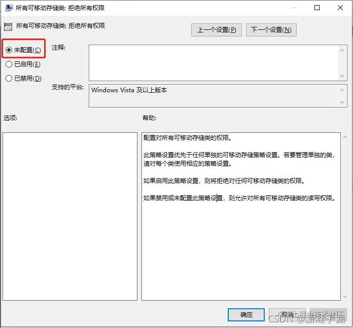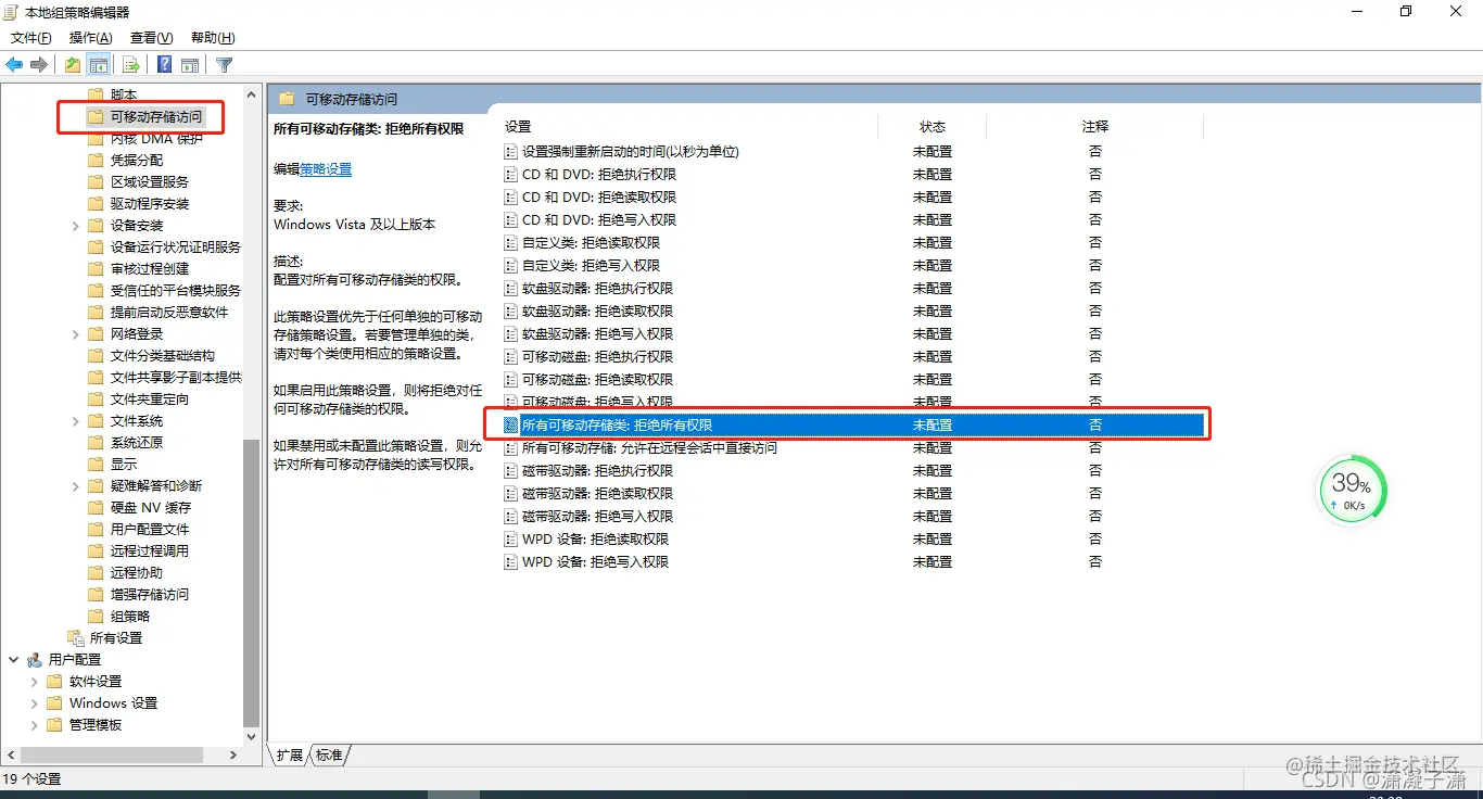 修复U盘插入电脑无法显示的问题 潇凝子潇 2022-11-07 51 阅读1分钟 本文已参与「新人创作礼」活动,一起开启掘金创作之路。 win+r 打开运行,并输入 gpedit.msc -> 点击 确定 , 打开本地组策略编辑器 编辑 选择 计算机配置 -> 管理模板 -> 系统 -> 可移动存储访问 ->所有可移动存储类:拒绝所有权限 并双击 打开 编辑 编辑 3. 勾选 未配置 点击确定即可 编辑 4. 进入我的电脑 查看磁盘显示情况