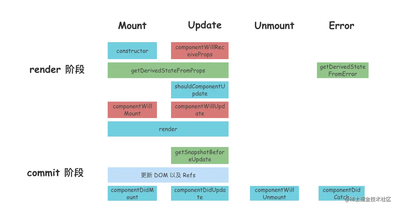注:红色为 React 17 已经废弃的生命周期钩子,绿色为新增的生命周期钩子
