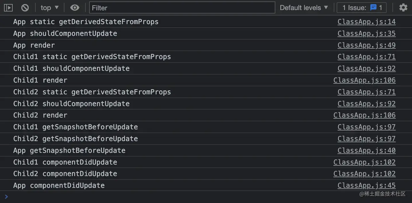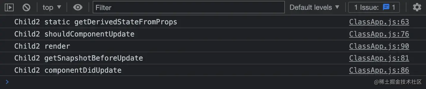可以看到,换成 getDerivedStateFromProps 后,不管是不是通过调用 this.setState 导致的组件更新,都会执行 getDerivedStateFromProps 生命周期函数。