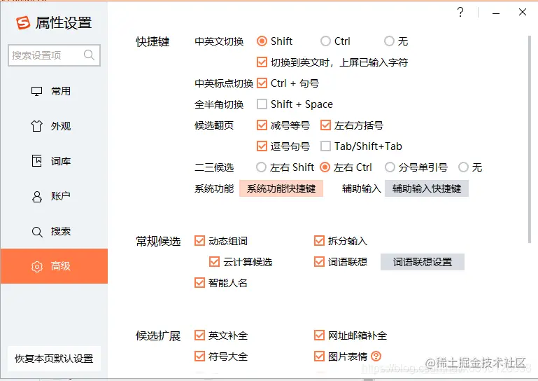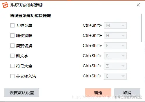 Windows 关闭搜狗输入法快捷键 潇凝子潇 2022-11-07 550 阅读1分钟 本文已参与「新人创作礼」活动,一起开启掘金创作之路。 在Windows下 idea eclipse 快捷键下 总是与搜狗输入快捷键冲突,顾关闭搜狗输入法快捷键以解决次问题 1.选择图标右击 编辑 2.属性设置 编辑 高级 -> 快捷键 -> 系统功能快捷键 编辑 选择要取消的快捷键 确定即可 编辑