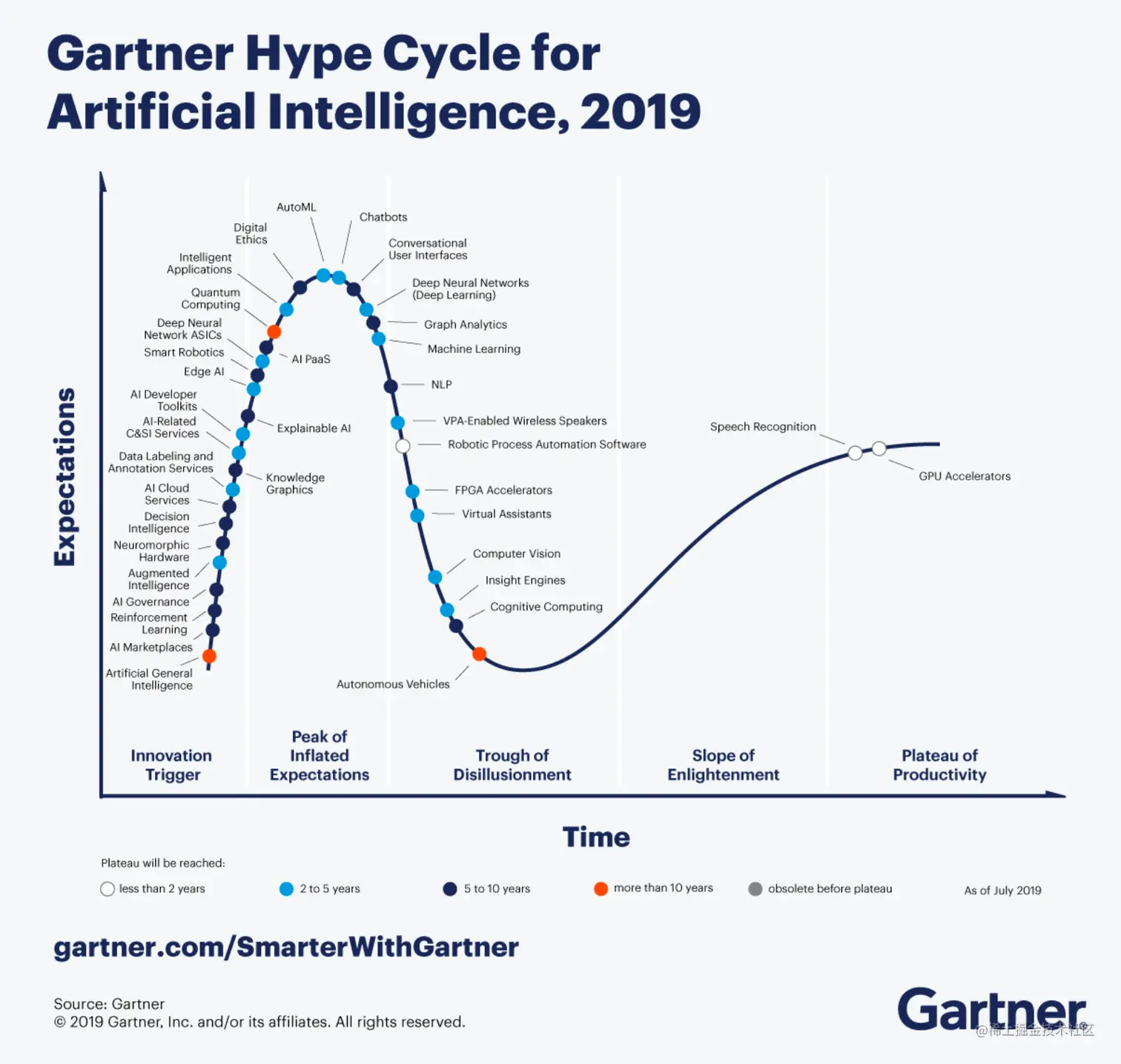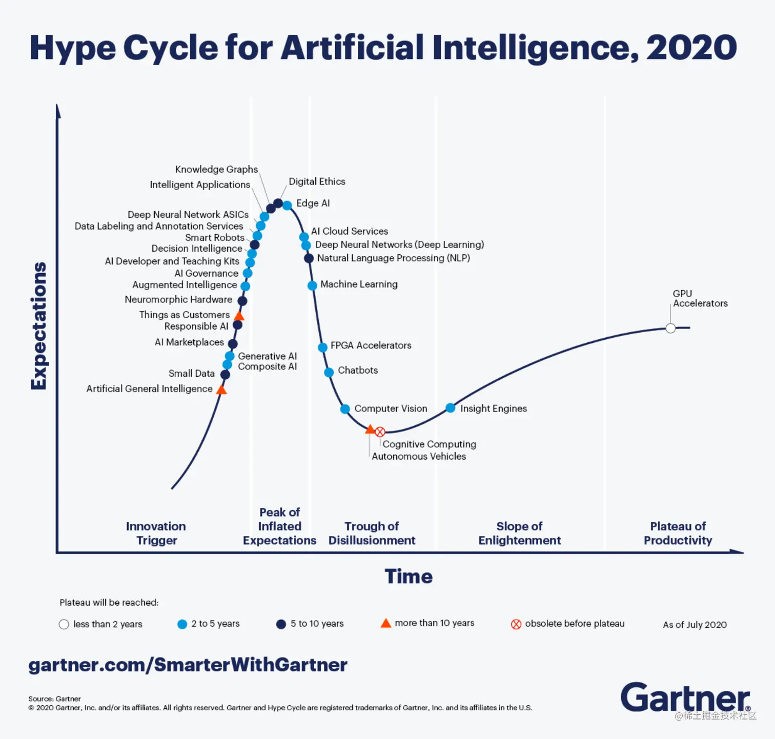 对比 2020 和 2019 年 Gartner 发布的人工智能领域的技术“成熟度曲线”(Hype Cycle),在短短 1 年时间,知识图谱的成熟度由创新触发阶段一跃达到预期膨胀高峰阶段且非常接近最高点。